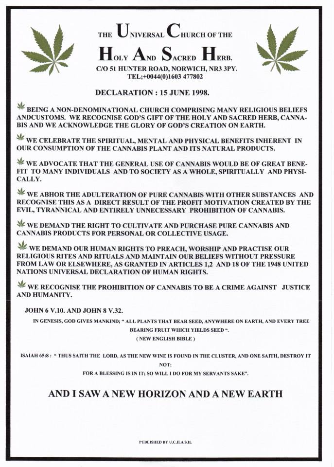 In the late 90’s a group of people decided to do something about campaigning for the right to use cannabis spiritually and so they formed The Universal Church of the Holy and Sacred Herb – UCHASH. The aim being to fight for what is supposed to be their right, ie the right to faith and religious freedom, beliefs and rites.
