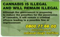 There then follows a massive legal section, way bigger than, say, the legal section about crack. The fact that you need to explain this in such great depths is no doubt because of the widespread acceptance of cannabis, however anyone glancing at this will be given the clear impression that cannabis is the main focus for enforcement, which isn't true. So how well does Frank work offline? Frank doesn't address the old chestnut of whether cannabis leads onto other drugs. A ukcia person e-mailed you with the question: "Does cannabis lead onto other drugs?" The reply was that Frank can't answer that one in e-mail, so he phoned for a chat. The helper gave a straight answer that it doesn't, but also seemed to imply some cultural connection with "other drugs", although she dismissed the idea of dealers offering other drugs, which enough of us know from personal experience happens only too often. Again though, this is a problem caused by the law, not by cannabis. The assistant promised to send some information about cannabis by post. An envelope arrived with a note from the National drugs helpline saying "sorry we have run out of the information you requested and it may be out of print". There was also a small credit card sized card which had in big letters
