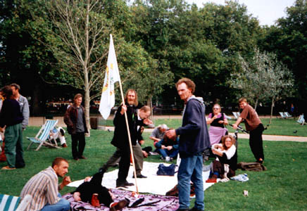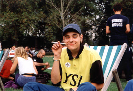 We'd heard about the plans for a "Turn yourself in" day organised by Mr Free Cannabis (Rob) from Glastonbury. The idea was to openly use cannabis and then go along to the local police station and, well, turn yourself in - "Please arrest me, I'm a cannabis user". Tthere seemed no better place to do this than in central London, speakers corner in Hyde Park.